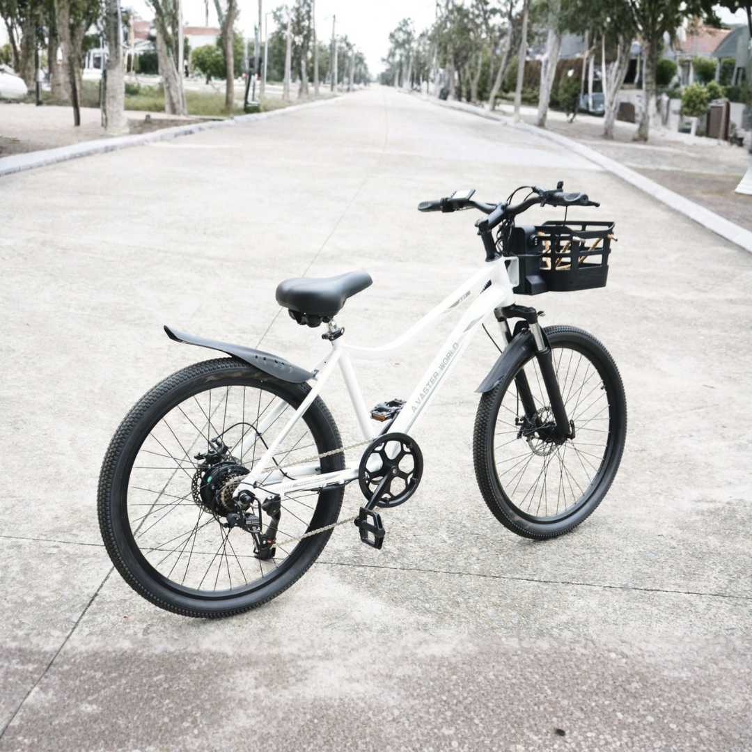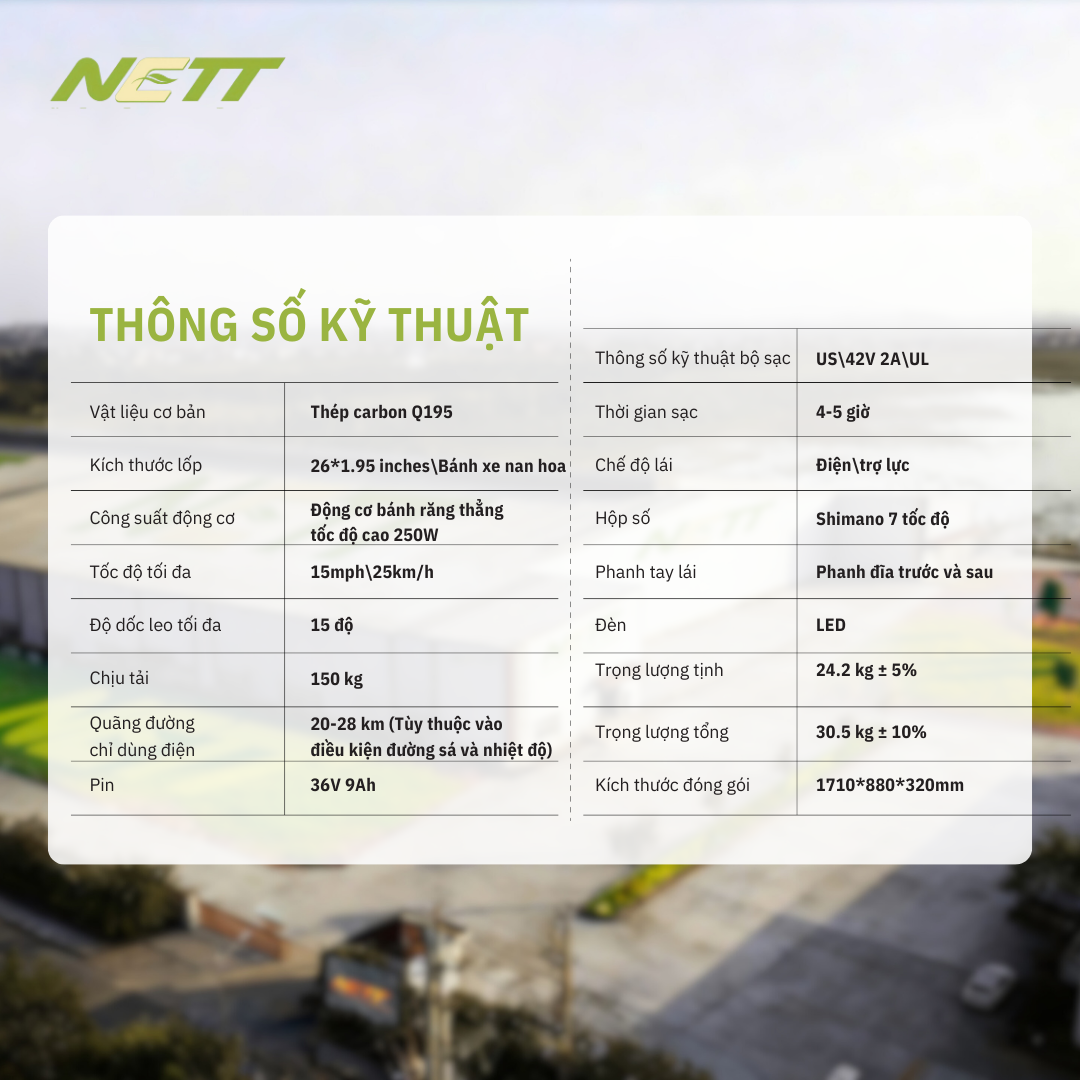 Chất liệu :Khung thép carbon Q195 Kích thước lốp:26*2.1 inches\Bánh xe nan hoa Pin:36V9AH Hành trình:20-28km Tốc độ tối đa:32KM/H Độ leo dốc tối đa: 15 độ Công suất động cơ: Động cơ bánh răng thăng tốc độ cao 250W Trọng tải:150KG Thông số bộ sạc: US\42V 2A\UL Thời gian sạc: 4-5 giờ Hộp số: Shimano 7 tốc độ Trọng lượng tổng: 27.3kg Kích thước đóng gói: 1420*260*740mm Ưu điểm:Khác biệt hoàn toàn với những dòng xe đang có trên thị trường, mẫu xe này mang đến một định nghĩa mới về sự tiện dụng. Điểm nhấn độc đáo nằm ở viên pin tích hợp ngay trong giỏ xe phía trước — có thể dễ dàng tháo rời để biến nó thành một chiếc giỏ mua hàng sành điệu hoặc mang về nhà sạc cực kỳ tiện lợi. Kết hợp cùng bộ truyền động Shimano 7 cấp và khung thép chịu lực cao cấp, đây không chỉ là phương tiện, mà là người bạn đồng hành thông minh cho mọi hành trình.